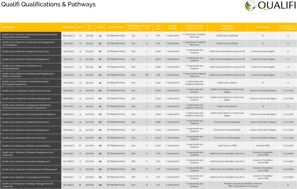 Please click below to see a full list of the qualifications available through Qualifi that are applicable for the Advanced Learner Loans.